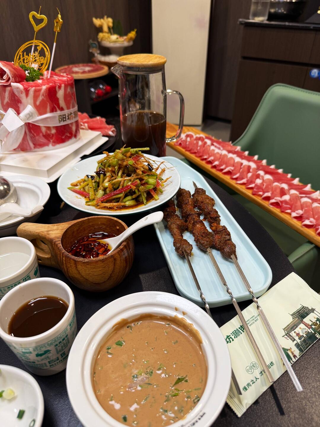 Once we sat down, in the middle of the table sat this cool "witch hat" shaped hot pot. It uses actual fire underneath to boil the water, which makes this a less common method of doing hotpot in larger cities. Buboli explained that because of the open flame, you rarely find this traditional style in the more central parts of Beijing anymore.