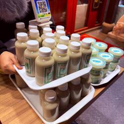 Afterwards, we went walking around the Beijing streets to pick up some street food. This trip had lots of food and I’m not surprised to find that I did not lose any weight after arriving back in America. While we were on our way to a place that sells various street foods, Buboli noticed a restaurant that was selling a well-known Beijing specialty called Douzhi (豆汁). This juice has a history of being produced for over 300 years as a common breakfast drink that promotes healthy digestion. That means that the age of this drink is even older than the entire existence of the United States!