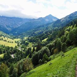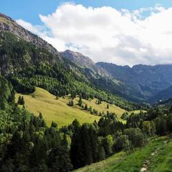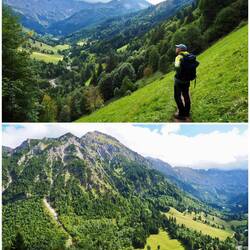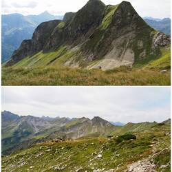 Gegen 14 Uhr setzten wir unsere Wanderung fort - sehr abwechslungsreiche Landschaft - ab und zu durch Wald, aber meistens über Grashänge mit schönen Ausblicken. Auf einmal tauchten die riesigen Felswände der Oberstdorfer Berge von ihrer Rückseite auf - Nebelhorn, großer Daumen usw. Das kam recht unerwartet und war richtig schick 👍🏼.