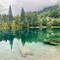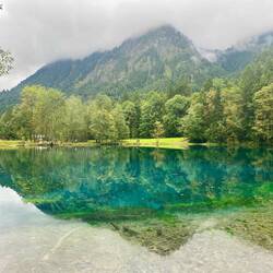 Am Nachmittag sollte der Regen aufhören und so machten wir uns und die Fahrräder startklar, vorsichtshalber nochmals in Regenklamotten. Das war auch gut so, denn es nieselte noch lange vor sich hin. Das hielt uns aber nicht davon ab, nach Süden immer entlang der Tretach zu radeln - zunächst an Oberstdorf vorbei, dann immer tiefer ins Trettachtal hinein. Nach 9km (und leicht bergauf) erreichten wir den Christlsee, ein kleines Naturidyll. Bei Sonne erstrahlt er wohl in türkisblau, aber selbst jetzt sah er sehr fotogen, fast mystisch aus. Nach ein paar Kilometer weiter erreichten wir die Spielmannsau und das Ende des Radwegs. Hier an der Spielmannsau startet für Viele der legendäre E5-Wanderweg, der von Oberstdorf nach Meran in 6-7 Tagen quer über Alpen führt. So auch für uns vor fast genau 14 Jahren und so wurden einige schöne Erinnerungen wach an unsere Alpenüberquerung 2011. 😄