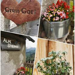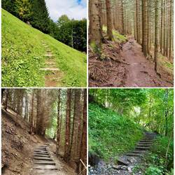 Nach einem Kilometer entdeckten wir ein Schild was den Weg zur Saloberalm zeigte - nur 40min. Davon hatten wir gestern gelesen, angeblich ein lohnender Aufstieg mit einem 4-Seen-Ausblick. Also spontan den Abzweig nach oben genommen, nach einer halben Stunde waren wir an der Alm. Überraschenderweise war sie geschlossen, darauf wies ein Schild hin. Wie schade… wir waren nicht die einzigen dort oben, die der Alm einen Besuch abstatten wollten. Die Alm liegt übrigens schon in Österreich, hier oben verläuft die Grenze. Zum 4-Seen-Blick sollte es nochmal 15 min weiter sein. Ok, dann nehmen wir wenigstens das in Angriff . Der Weg wurde recht schnell anspruchsvoller, sehr wurzelig, teilweise felsig, hie rund da mit Seilen gesichert. Wir hatten heute keine richtigen Wanderschuhe an und auch keine Stöcke dabei (wandern war ja gar nicht geplant…), aber unsere Schuhe haben zum Glück auch gut halt.