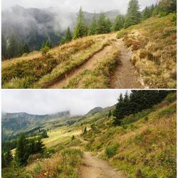 Unweit der Alpe weist zweigt ein Weg nach oben in Richtung der Oxhsenkopfscharte. Jetzt kam der erste richtige Anstieg des Tages, teilweise über recht steinige und geröllige Passagen, später an einem schmalen Weg direkt an einer Graskante, aber alles gut machbar. Oben auf der Scharte standen wir fast im Nebel, die Sicht auf der anderen Seite fast noch eingeschränkter. Egal, wir stiegen trotzdem ab - jetzt war es etwas anspruchsvoller, zum Teil auf Ketten versichert und aufgrund des Regens der letzten Tage auch ziemlich rutschig. Wir waren froh, als der Weg wieder etwas ebener wurde. Eigentlich eröffnet sich einem hier das Schwarzwassertal mit tollen Blick auf den markanten Ifen - Heute leider gerade der Ifen ziemlich von Wolken verdeckt. Die Sonne hatte sich trotz Vorhersage heute einfach leider nicht durchsetzen können. Im Gegenteil, die Wolken nahmen zu und später beim Abstieg zurück nach Hirschegg setzte auch noch Nieselregen ein. Deshalb stoppten wir auch nicht mehr an einer der drei Hütten, an denen wir noch vorbeikamen. Gegen 15 Ihr erreichten wir den Ort, warteten eine Weile auf den Linienbus, der uns zurück nach Oberstdorf bringen sollte. Der war übrigens brechend voll trotz der engen 10-min-Taktung.