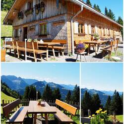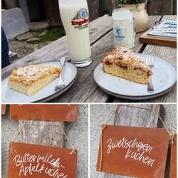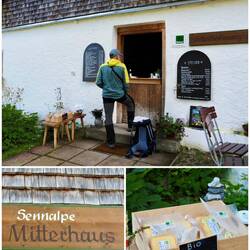 Eine weitere Stunde später erreichten wir die nächste Alm - Sennalpe Mittagshaus. Hier war fast gar nicht los - eigentlich nicht zu verstehen, es war Sonntag, die Sonne schien und man konnte die Alm nicht nur zu Fuß sondern auch per Rad erreichen. Weil es so idyllisch hier war, gönnten wir uns jeder noch ein Getränk und für daheim nahmen wir uns einen frischen Bergkäse mit.