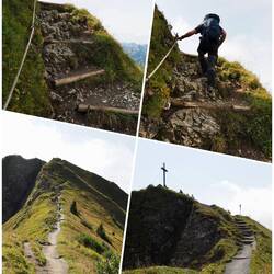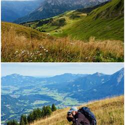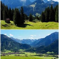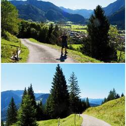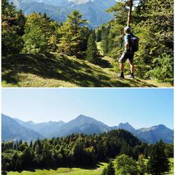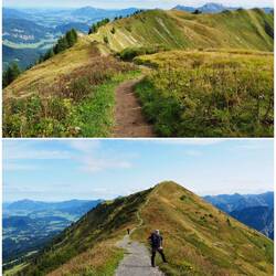 Der Weg nach oben führte stetig bergan, meistens in der Sonne aber mit herrlichen Ausblicken auf die Ortsteile von Bad Hindelang und die umliegenden hohen Bergketten. Man konnte irgendwann bis ins komplette Kleinwalsertal sehen und auch alle Berge - Ifen, Widderstein, Nebelhorn, Hindelanger Klettersteig und und und…