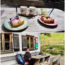 Nach einer Stunde erreichten wir die erste Alm - die Strausbergalpe. Drinnen war alles voll, also setzten wir uns zunächst als einzige Gäste außen hin. Anfangs war es noch schattig und windig, aber die Sonne gewann so langsam die Oberhand und wir waren froh, im Freien zu sein. Es gab leckere heiße Schokolade und Kuchen. Mittlerweile waren auch alle Regensymbole 🌧️ auf der Wetterapp verschwunden - perfekt. Die Alm war übrigens richtig schnuckelig und liebevoll gestaltet.
