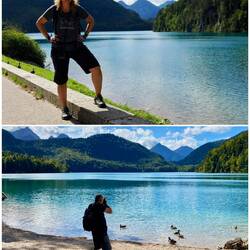 Unsere Route führte anschließend direkt zu den beiden Königsschlössern Neuschwanstein und Hohenschwangau - kaum hatten wir die großen BesucherParkplätze erreicht, wimmelte es nur so von Touristen. Nicht wenige aus Fernost… 😉 schon verrückt, wie hier nur wenige hundert Meter zwischen totaler Idylle und Touri-Auflauf liegen. Wir ließen uns aber nicht abhalten, vorbei an all den Menschen, Souvenirshops und Pferdekutschen zu radeln, um ein bisschen am Alpsee zu schlendern.