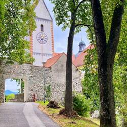 Nach dem Frühstück (draußen in der Sonne ☀️!) packten wir unseren Kram zusammen und starteten gegen gegen halb 11 zu unserer Tour. Zunächst ging es mit den Fahrrädern zur knapp 4km entfernten Talstation der Tegelbergbahn. Unterwegs gab’s noch einen kleinen Fotostopp an der fotogenen Kirche St.Coloman.