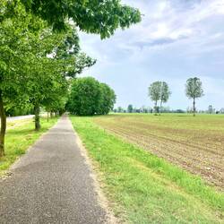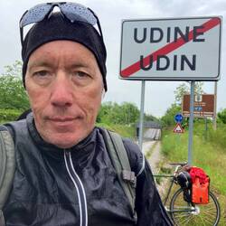 Die ganze Zeit kam bei warmer Witterung ein leichter Nieselregen runter. Die ersten 40 km bis Udine verliefen flach und unspektakulär - kleine Ortschaften verbunden von schmalen Landstraßen. Aber selbst für eine kleine Pause bot sich nichts an. In Udine fand sich eine tolle Bar („IS - Italienische Spezialitäten“). Danach folgte ein kleiner Stadtrundgang und schon ging es ähnlich weiter wie vorhin. Der Regen wurde etwas stärker und der weiße Sand der Straße verströmte ein Hauch von Toskana (Strade bianche“).