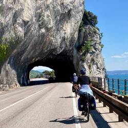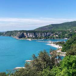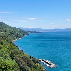 Meine Fahrt ging weiter durch die Lagunenstadt, eine kleine Pause in einer Bar, vorbei an Campingplätzen … mittlerweile mit einem frischem Gegenwind. Durch Naturparks mit viel Wasserflächen führte die Strecke im stetigen Zick-Zack mich durch die Montafalcone. Kurz davor stand ich vor einer aufgerissenen Straße und musste an langen Umweg fahren, eine Passage führte dann noch über den Standstreifen einer Schnellstraße. Einige Kurven und Höhenmeter später war ich jedoch auf der Küstenstraße SS14 und konnte die wunderschöne Aussicht genießen. Ich machte mehrere kleine Pausen, um die Zielankunft - und das Ende der Tour - hinauszuzögern. An einem „Point of view“ wurde ich von einem Radlerpärchen angesprochen „Kommst du aus Norddeutschland“?! Wie sich herausstellte, kam die Frau ursprünglich aus Husum und wohnt jetzt in Bremen. Zusammen mit ihrem Mann wollte sie in den nächsten 8-10 Wochen durch Italien, Slowenien und Österreich fahren. Zusammen fuhren wir die letzten Kilometer bergab nach Triest, sagten „Tschüß“ und jeder suchte sein Quartier. Meine Unterkunft lag sehr zentral in der Altstadt. Ein letztes Mal absteigen, Fahrradcomputer stoppen und … „schon“ endete hier mein Alpe-Regio-Radweg! Gefühlt gerade eben erst in München aufgestiegen und „schon“ bin ich hier …