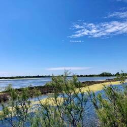 Allmählich wurde ich (positiv) nervös im Wissen gleich die riesige Lagune vor Grado zu erreichen. Bei den Planungen im Winter habe ich immer wieder Fotos von dieser Straße auf dem Damm gesehen, die mehrere Kilometer lang ist und von einem (… oder eigentlich zwei) markanten Bäumen geteilt wird. Die Strecke bin ich bewusst langsam gefahren und habe mir immer wieder die Landschaft rechts und links angeschaut … eine Mischung aus Wattenmeer und amerikanischen Sümpfen. Und schon ging es mit vielen anderen Radwanderer hinein in die Stadt … und die Suche nach einem „ultimativen“ Endpunkt. Ich habe mein Rad auf eine Landzunge geschoben, um ein erstes „Finisher-Foto“ zu machen. Dort traf ich auf einen freundliches Österreicher, der von meinem Start in München hörte und mit Fingerzeig auf mein PASHLEY meinte „Noo suuper, miet deem olden Radl“?!