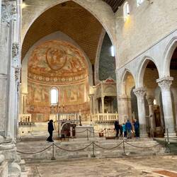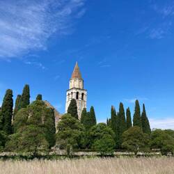 Am Bahnhof bekam ich ein Ticket für 8,- Euro, um damit bis Cervignano del Friuli zu fahren. Von da aus musste ich doch tatsächlich meine Regensachen herausholen. Zuerst fuhr ich bis Aquileia - dort hatte ich auf der gestrigen Etappe die Basilika ignoriert. Meine Radbekannte von gestern aus Bremen hatte mir einen Besuch empfohlen. Bereits im 4. Jahrhundert begann die erste Bauphase, aus der Zeit stammt ein riesiger Bodenmosaik. Diese wurde irgendwann überbaut und erst vor circa 100 Jahren wiederentdeckt.