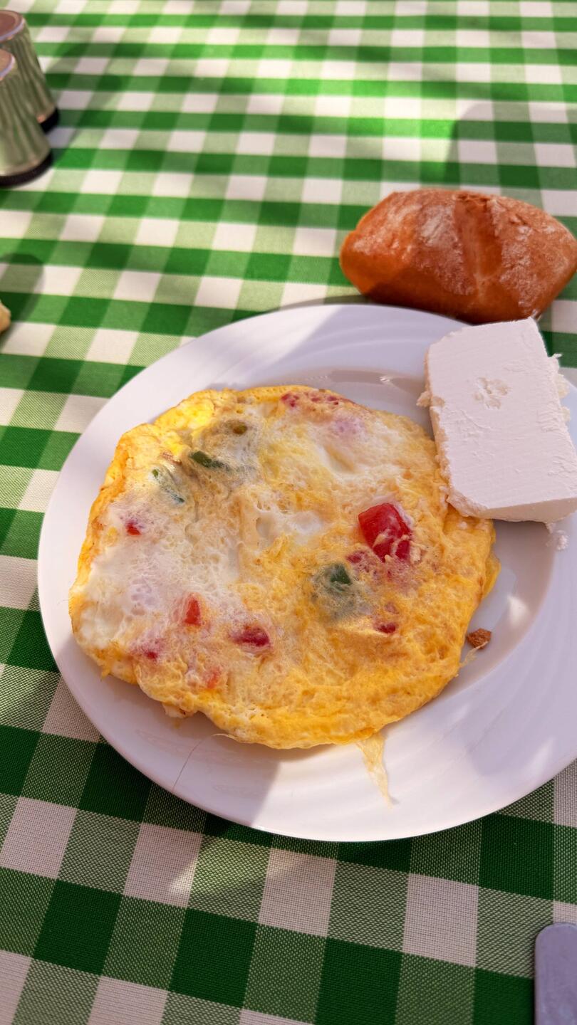 Ein mit von der Eier Manufaktur am Frühstücksbuffet hergestelltes Omelette.