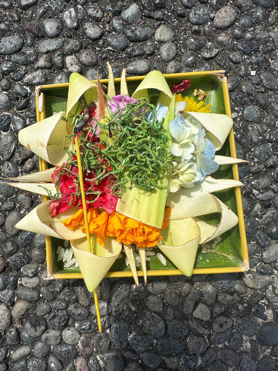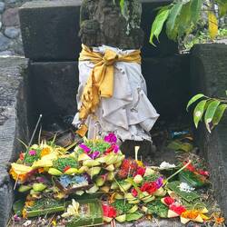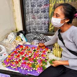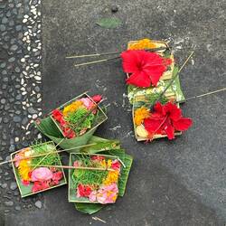 Alltag & Religion sind eins: Tägliche mehrfache Opfergaben (Canang Sari) vor jedem Geschäft, jedem Haus, vor jedem noch so kleinem Warung (Restaurant oder Verkaufsstelle) liegen Opfergabe aus Blumen und Räucherstäbchen