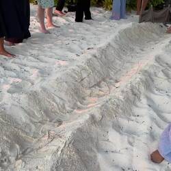 Quick background … when we arrived, we were told there was a turtle nest on the island that they were waiting to hatch. They thought it hatched two days ago in the middle of the night and today was to be an exploratory excavation to see if any baby turtles didn’t make the climb out. Instead … the nest explodes with babies! There is a video where my new marine biologist friend (who loves turtles) explains it all. What an event! Everyone was literally rooting for them as they scurried down the sand slope and made it to the water.