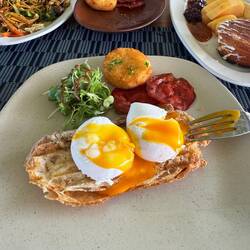 Late breakfast but still in time for Rocket 🚀 Fuel and pancakees … and for Mike to delight in Egg Benedict, which has been a go-to for him the last few days. A little tutorial of breakfast has been provided so you really get the lay of the “land”.