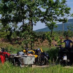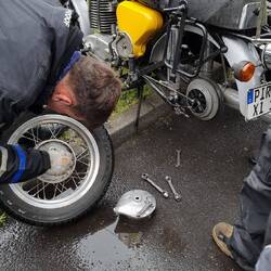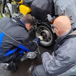 Der erste Tankstop wurde gleich genutzt um die allgemeinen Werkzeugressourcen zu testen. Bei Alex war die Hinterradbremse fest und heißgelaufen.