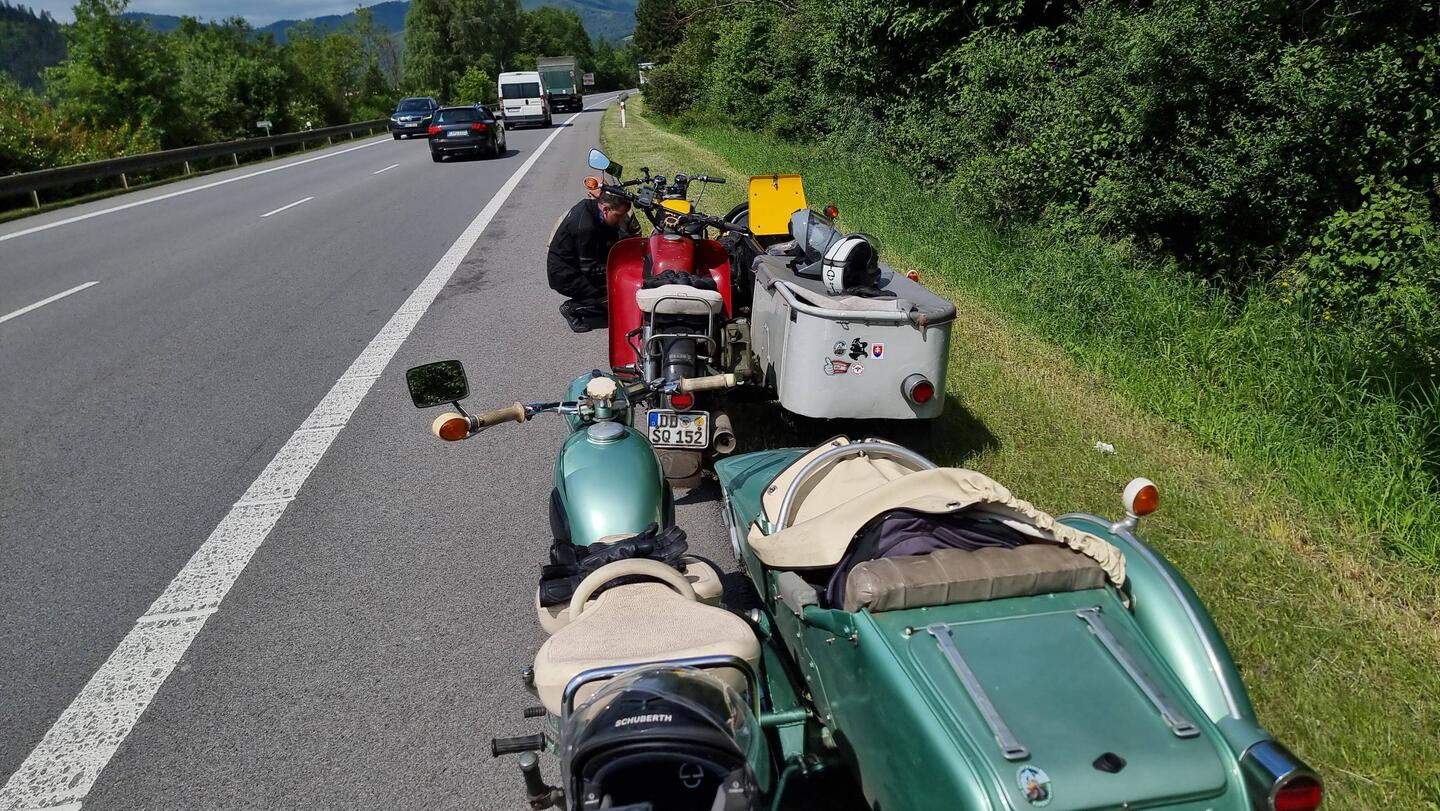 Mitten auf einer viel befahrenen Europastrasse, wo sonst😅, kurzer Schreck Alex's Motorrad komplett aus, Elektrik tot.