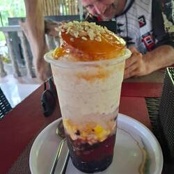Zum Nachtisch gönnten wir uns noch ein Halo-Halo. Das ist ein typisches Dessert hier, auf das ich schon ewig ein Auge geworfen habe. Auch das entpuppte sich als eine crazy Mischung aus crushed ice, Kokosmilch, Gelee, weißen Bohnen, Mais, komisches lila Püree....schmeckte irgendwie ganz geil, aber wer sich das Gericht ausgedacht hat wöllte ich schon mal gern wissen 😅
