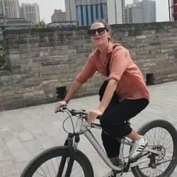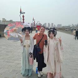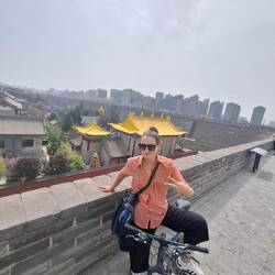 Am Freitag dachten wir eigentlich zur berühmten Terrakotta- Armee zu fahren. Doch wir hatten nochmal Berichte gelesen, dass dort uuuultra viel los ist und man die Figuren nur aus der Ferne sehen kann. Also eventuell - wenn nicht tausend Leute vor einem die Sicht blockieren. Wirklich alle Berichte waren so negativ belastet. Hatten wir gar keinen Bock drauf und so scharf auf alte Steine sind wir eh nicht. Also fuhren wir lieber in die Innenstadt und kletterten auf die Stadtmauer. Die ist richtig breit und führt einmal komplett mit 14 km Strecke um den Altstadtkern herum. Wir liehen uns ein Fahrrad und gurkten einmal drum rum. Hat echt richtig Laune gemacht. Viel los war auch hier wieder und wir sahen überall hübsch angezogene Frauen und Männer - in traditionellen, an die Tang Dynastie angelehnten Outfits. Alle machten Fotos von sich, teils profimäßig mit Fotograf.