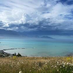 Weil das Wetter heute noch so gut ist, fahren wir zuallererst zu einem Lookout oberhalb von Kaikoura und genießen dort lange den wunderbaren Ausblick.
