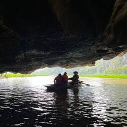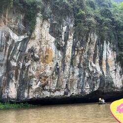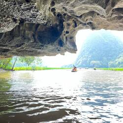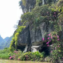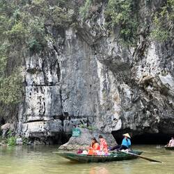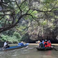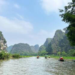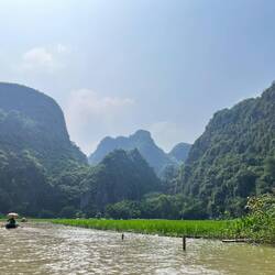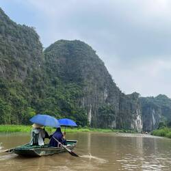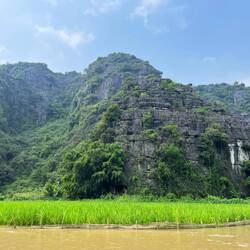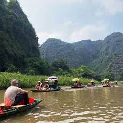 Nächster Halt: Tam Côc, auch genannt „Halong Bay on the land“. Hier fährt man auf Booten 1,5 Stunden auf dem Ngo Dong River. Entlang grüner Reisfelder, steiler Kalksteinfelsen. In der Gegend gibt es viele Höhlen, durch die man teilweise hindurchfährt. Kopf einziehen und Sonnenschirme einklappen!