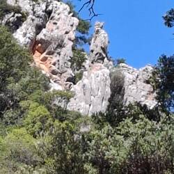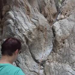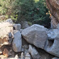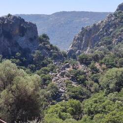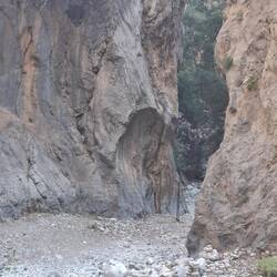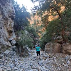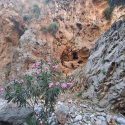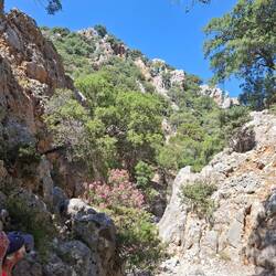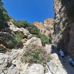 Die Wanderung führte uns in einen ausgetrockneten Flusslauf, der sich tief durch die Landschaft gegraben hat. Hohe, teils zerklüftete Felswände rahmten den Weg ein, der über Geröll, größere Steine und trockene Erde führte. Der Pfad war stellenweise schmal und uneben, aber mit festem Schuhwerk gut begehbar. Umgeben von Felsen, wildem Oleander und trockenem Buschwerk bewegten wir uns durch eine beeindruckende, stille Naturkulisse.