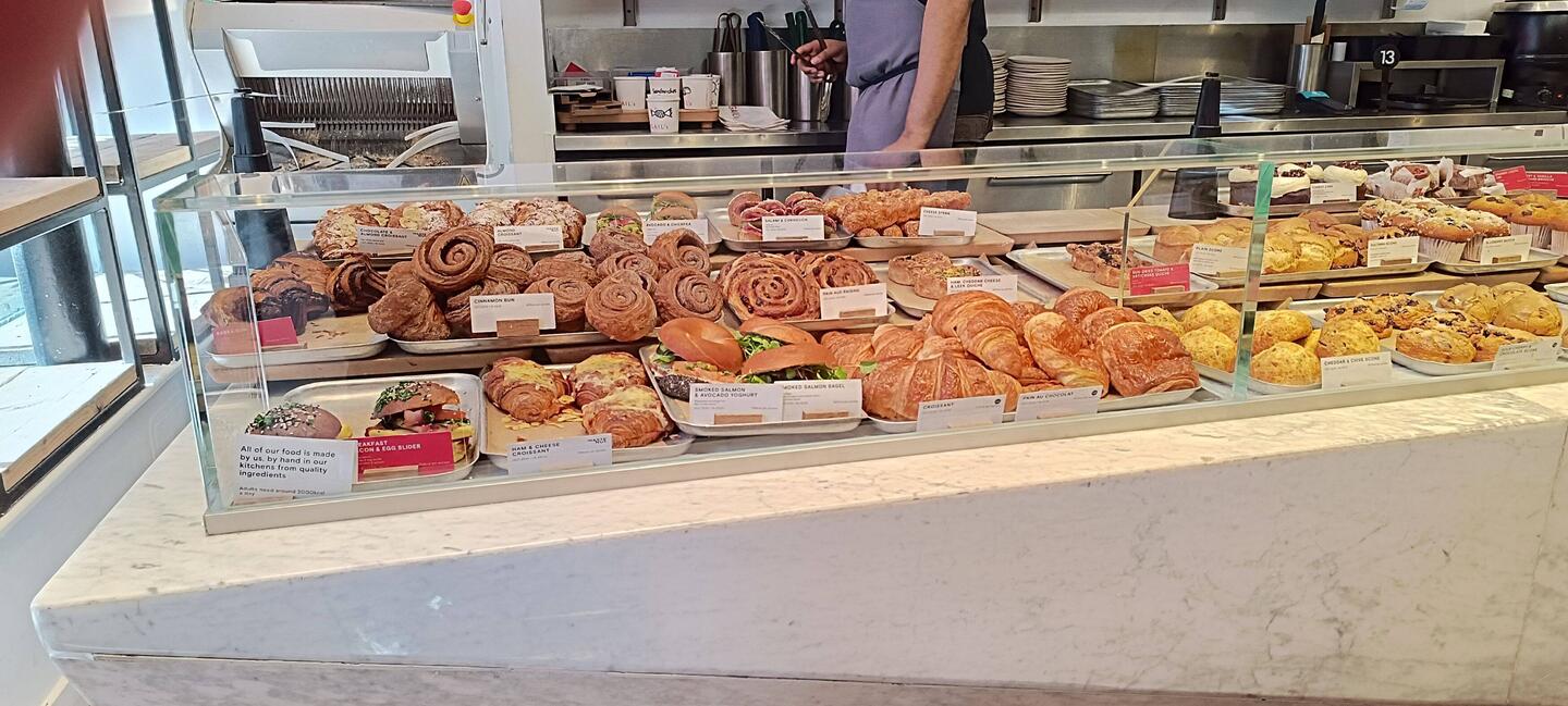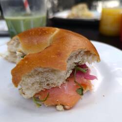 Den Tag beginnen wir mit einem tollen Frühstück. Es gibt leckere Quiche, Scones (Brötchen ähnlich) und Lachsbagel. Mia gönnt sich ein ICE Macha Latte bei Omi gibt es ein Latte Macchiato....huch,Læs mere