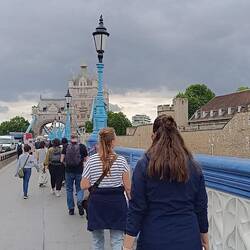 Heute steht die Tower Bridge auf unserem Plan und ganz spontan sind wir auch hinein gegangen. Es war sehr informativ und interessant. Vor allem der gläserne Übergang zwischen North and South Tower.Læs mere