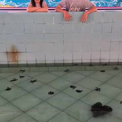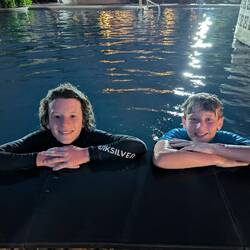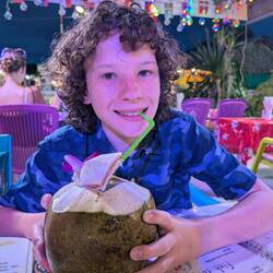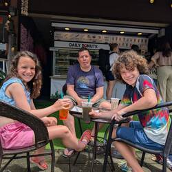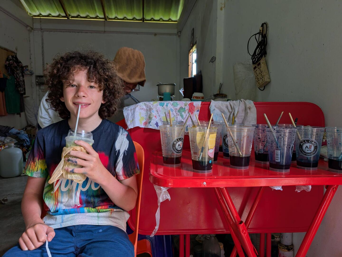 The kids queuing for iced green milk tea at breakfast and pool and lunch with friends (Daniel and Aimee from Nottingham)
