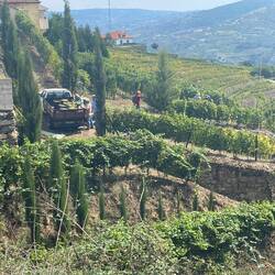 The contrasts are so stark. There are huge modern wineries with gleaming stainless steel vats. There is an elevated highway that seems to fly over the hills. There are lots of high voltage transmission lines. Peso da Regua is busy noisy city with a lot of business going on. But almost all day, I was walking through tiny villages where most of the houses are boarded up or in ruins, or on narrow paths between stone walls, or through a few beautifully restored estates offering wine tasting. And in at least six or seven of the vineyards I passed, there were crowds of people picking grapes by hand. I didn’t see any machinery at all, just people stooped over picking or carrying buckets of grapes on their heads.