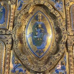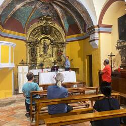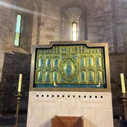 It was a rough climb, but not absurdly hard. The cafeteria at the church was closed today, which I think kept the visitors down. The church was open, however, and I was in it all by myself. There is an enamel and gold altarpiece that is really unbelievable. It is the same kind of workmanship as a little box that I remember seeing in León in the museum of San Isidoro. But that was a tiny box, and this is an enormous altarpiece, with Mary in the middle and lots of Saints and angels around. It was just spectacular. And real candles too! So I was able to sit and think about a lot of things and a lot of people.