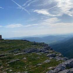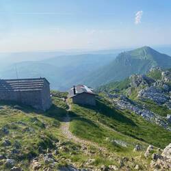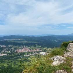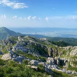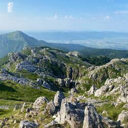 I took a taxi to a good starting point, and off I went by about seven. It was really beautiful, through a dense beech forest with lots of moss covered rocks. When I got out of the forest, there were just views all around me. Lots of rocky crags, lots of views of towns and big fields below with shepherds’ huts. I met two groups of young people on their way down. They had slept up there, just on mats and a sleeping bag. It seems to be a popular custom for young people in the area.