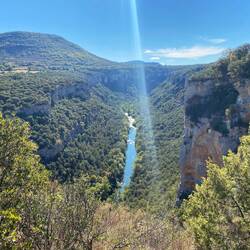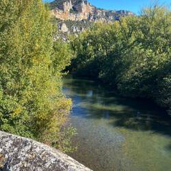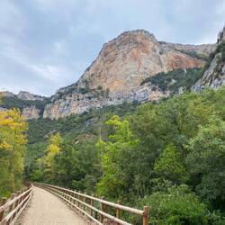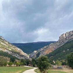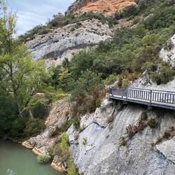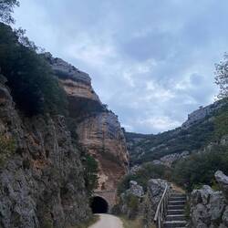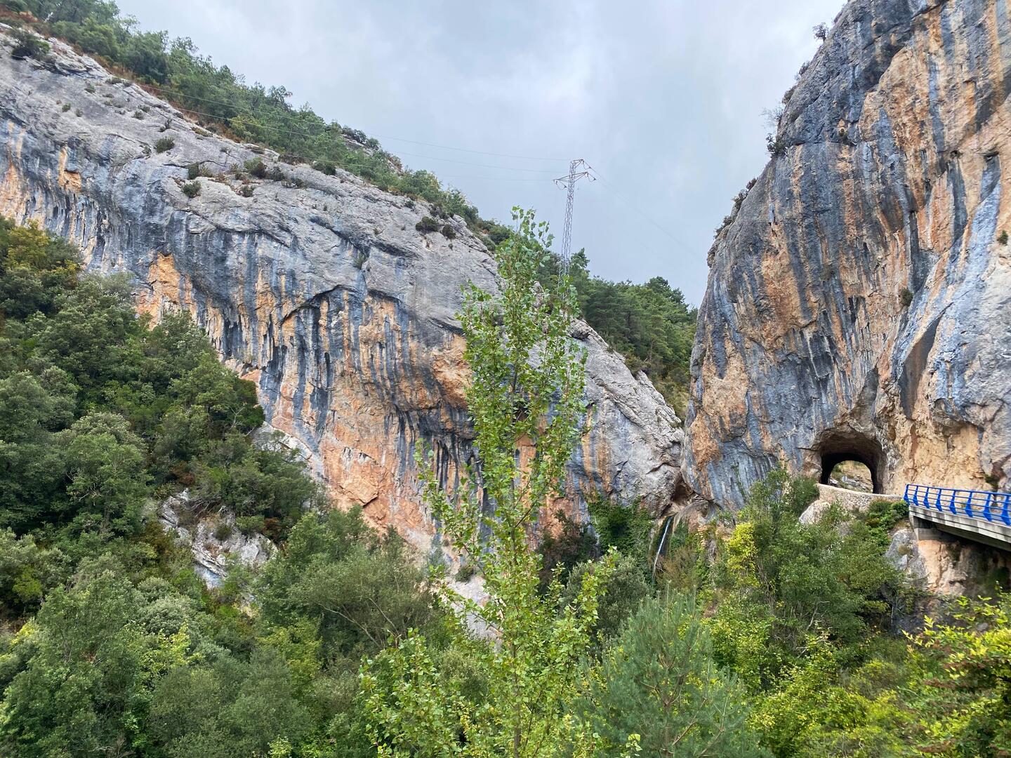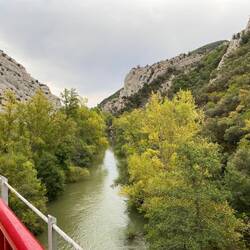 I was happy to confirm that the route through the gorge from Oña to Trespaderne has indeed been finished. The one piece left hanging for many months/years??? was a wooden footbridge over the Ebro river. This is part of the never finished railway line that was supposed to go from Santander in the north to Valencia on the Mediterranean. Some small sections apparently became operational, but for the most part, it was never used. Now it’s being repurposed as a walking/cycling route. And today, being Sunday, there were tons of people. And portions of this route were really beautiful, with those reddish tinted cliffs, going way up on either side.