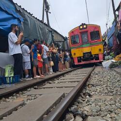 Erster Halt: Der Maeklong Railway Market. Hier müssen die Verkäufer ihre Stände schnell zusammenpacken, während der Zug millimetergenau an ihnen vorbeifährt. Es ist so ähnlich wie in Vietnam letztes Jahr, nur dass hier deutlich mehr Alltagsmarkt vorherrscht. Hier liegen Meeresfrüchte neben Souvenirs, Räucherstäbchen neben Gemüse und Spielen. Ein Trubel welcher seines Gleichen sucht. 🚂