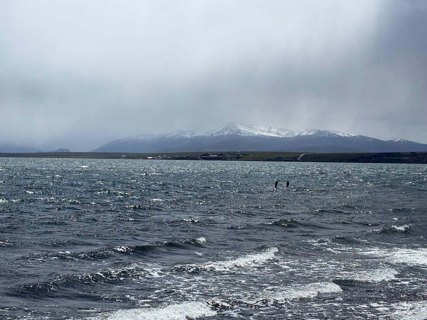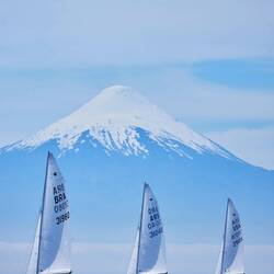 The first two days of racing the sky was very clear and the sun was HOT at that low latitude (41°S). Even though, when the breeze was up and it was wet with full thermal hiking pants, a smock, tech hoodie of the cap and a life jacket, it was not hot. But the most amazing thing was the views of the Volcanos across the lake. Lisa kept saying - endlessly! - how distracting starboard tack was with that view.