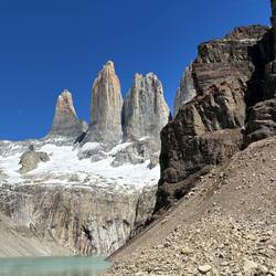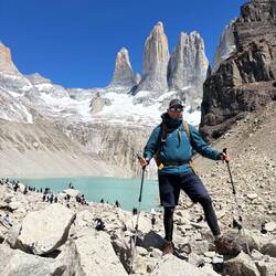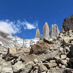 It was a very chilly morning but the cloud cover cleared by the hike start and the outer layer didn’t last long. We started a little on the late side at 9:15 (for the early shift anyway) and the reviews said it would be sort of a “conga line” affair which turned out to be pretty much true as this is the most popular hike in the park. It’s rated hard due to the length but is pretty accessible for a fit hiker, adding to the number of people that do it. That said, I was a bit surprised to see some really young kids and some adults that looked pretty out of shape. I’m a reasonably fit guy and it was hard for me. But then again, I do have to enroll in Medicare this year… It’s mostly just walking up with a number of steep spots, switchbacks, and rutted paths though wooded areas and much of the surface was loose granite rocks. Trekking poles really helped. The last 1.5k gets much steeper, just shy of “scrambling” but you had to pick your way through the boulders and seemed like it went on forever. Just when you think it was right around the corner there was another pitch. But eventually you could see Las Torres peak (pun intended) over the rock and the next turn was the “Ta Da” view.
