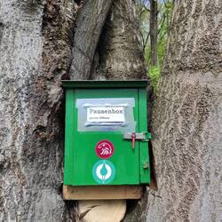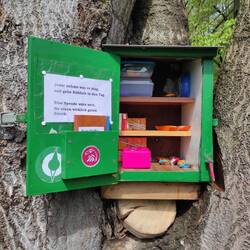 Dafür gab es unterwegs "Trailmagic" in Form einer Süßigkeitenbox mit Riegeln und Trinkpäckchen gegen eine Spende für einen guten Zweck nebst einem kleinen Gästebüchlein, wo ich auch einen Eintrag einer NST Hikerin gefunden habe, die nur ganz kurz vor mir dort war 🤩