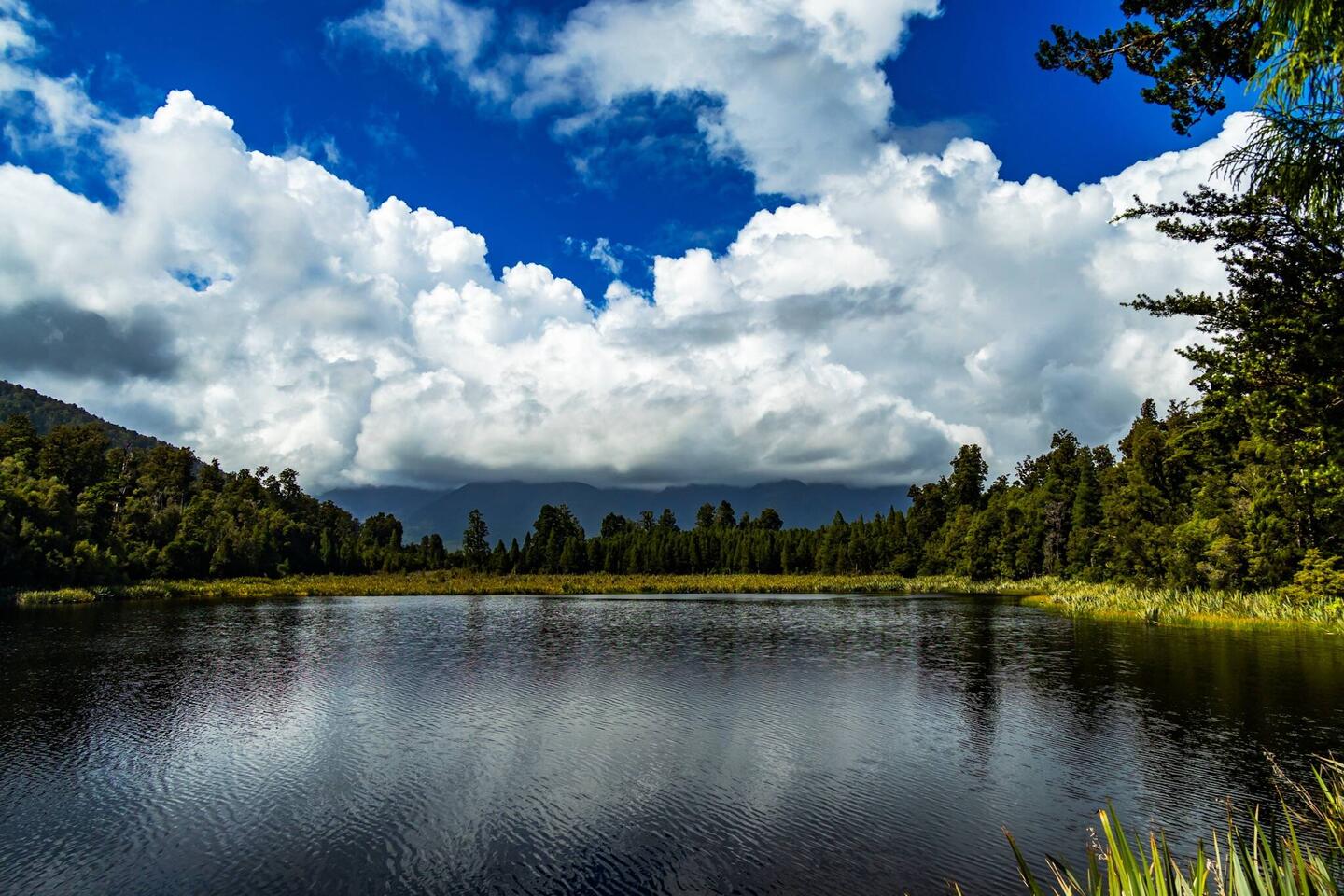 Maddie and I had checked out the lake two days ago, but all we could confirm was that there was a lake—it was far too rainy and foggy to see anything else. Lake Matheson is famous for its perfect mirror reflections under the right conditions. Today’s weather was arguably better, but the spectacular mountains remained hidden behind clouds, and a gentle yet disruptive breeze rippled the water.