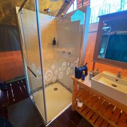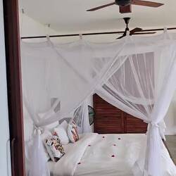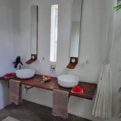 Bij het aankomen van onze Lodge vallen we allebei toch wel even stil, adembenemend, prachtig een paradijsje, de badkamer is nog mooier dan de allerduurste spa, we kijken elkaar aan zeggen tegelijkertijd hier willen we niet weg, alleen om te eten en in zee te zwemmen maar hier zullen we de komen vier dagen veel zijn.