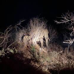 In het begin is het nog licht maar al snel valt de schemer en wordt het donker, onze ranger schijnt met een groot licht van links naar rechts om dieren te spotten, en ja hoor we hebben twee hyena’s in het vizier, prachtig echt een kippenvel momentje, daarna nog een kudde olifanten die heerlijk aan het eten zijn.