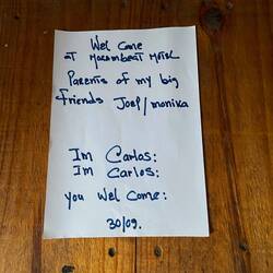 Daarna brengt hij ons naar onze Lodge, dit is dezelfde als waar Joep en Monika ook hebben geslapen. Hier ligt een lieve brief van Carlos voor ons klaar en een kaart met de namen van onze Monika en Joep, zo lief, zo verdrietig, gelukkig blijven we hier een paar dagen en kunnen we wat rust pakken.