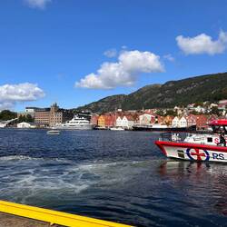Bergen. Auch Hauptstadt des Regens genannt. Es soll dort mehr als 2.000 Millimeter pro Jahr regnen. Um so glücklicher sind wir, als uns bei unserer Ankunft ein strahlend blauer Himmel erwartet!