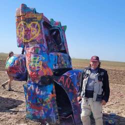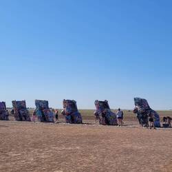 Back to NeufundlandTexas 🤠🤠 July 30, 2023 in the United States ⋅ ☀️ 21 °C Heute zeigte sich die historische Route 66 von ihrer schönsten Seite anfangs ging es über Offroadwege, zum Teil sandig, ging es durch das weite Land. Nach der Bugranch und der Cadilacranch kamen wir zum Midpoint der Route 66.Read moreSee translation3 likes Show trip