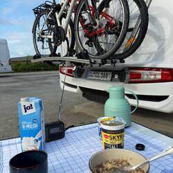Morgens noch Regen und Gegenwind am Mjøsa 🌧️💨 – kurz überlegt, ob wir einfach dort bleiben und uns in Enten verwandeln.