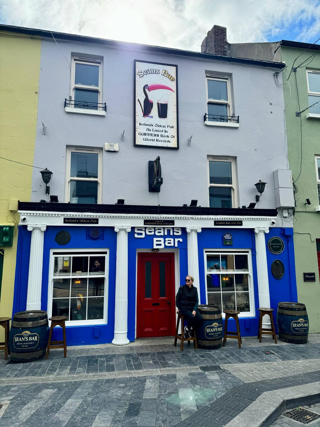 It is in Athlone, about an hour’s drive from Galway. Easy drive straight along the freeway. We had planned to go to the Castle and the Art Gallery as well but they are both shut on a Monday. Oh well, off to the pub it is. Turned out to be a great time to go. Just on opening so not many people around. The lovely barmaid made us an Irish coffee, delicious! We stayed there people watching as the bar got busier and busier. Of course we had to have a Guinness in the oldest pub in the world before we left. Great experience and great atmosphere at this pub.