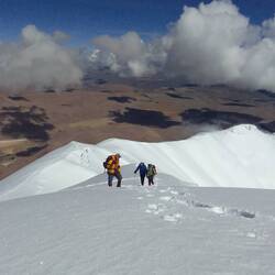 1h du matin et déjà debout. Tout le monde se prépare pour le départ à 2h. Après 1h30 de route et une ultime préparation sur place, on attaque la montée vers 4h, à la frontale. Nous montons sur un rythme tranquille. Après 2h, deux groupes commencent à se dessiner. Moi, Emilien et Adèle, qui sortent tout juste d'un autre 6000 au dessus de La Paz, dans les pas de Nelson, Charles Coralie et Allan un peu plus bas avec le deuxième guide. Plus nous montons, plus je me demande quand va venir ce moment où je vais commencer à trouver ça dur. Et bien ça n'arrivera jamais, à 5800m je suis en train de discuter foot avec Nelson, on rigole tout le temps, notre trio monte vraiment facilement. Après un moment, on piétine un peu car on regarde en arrière le groupe qu'on ne voit plus. Après presque une heure de flottement à avancer sur un demi rythme on aperçoit seulement Coralie et Allan avec le guide. Charles est redescendu après s'être engueulé avec le guide sur les normes de sécurité après un passage légèrement exposé. Finalement nous continuons à monter, les deux derniers murs sont les plus raides mais ils se montent bien. Sur les 50 derniers mètres je m'élance en petite foulée puis en marche rapide pour arriver à bout de souffle au sommet. Il aura fallu ça pour être fatigué. 6052 m, c'est fait. La vue est magnifique. On attends pendant une heure environ le duo de derrière et après on photo tous ensemble on attaque la redescente. À un moment, on se laisse glisser sur les fesses dans un couloir qui nous fait gagner beaucoup de temps. Tout le monde se rentre dedans, ça rigole dans tous les sens. Finalement après 2h de descente, nous retrouvons le 4x4. Retour à Sajama en début d'après midi et préparation du retour à la civilisation demain.Baca lagi
