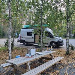 Wir planen 2 Nächte auf einem Camping am Oulujärvi, aber der erste Camping schließt gerade und weitere sollen auch schon zu haben. Nachsaison.... So landen wir auf dem Happy Beach Camping. Nicht wirklich der Renner, aber alles vorhanden, was man braucht. Dieses Wochenende ist auf dem Platz das Treffen der nordfinnischen Kabe Fans (die Wohnwagen) mit allem drum und dran: Wagenburg, Saunaspass, Karaoke und Feuerwerk👍.