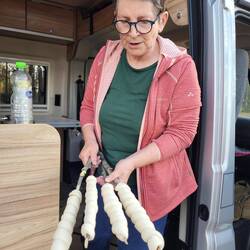 Wir haben jedoch ein anderes Projekt: Stockbrot! Ich bin für die Stöcke, Elke für den Teig zuständig.