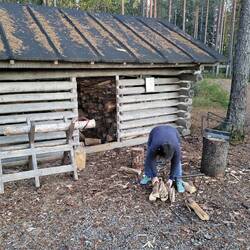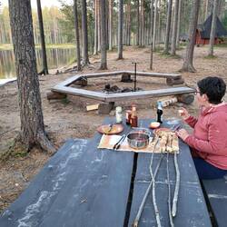 Die Nacht war kühl, aber der Morgen verspricht einen klaren Sonnentag. Wir haben eine 22 Kilometer Tour durch den Nationalpark geplant, z. T. sind hier Fahrstrecken ausgegeschildert. Was für eine super schöne Tour. Immer wieder neue Perspektiven auf die einsame Landschaft mit Seen und Wald. Es geht ordentlich hoch und runter, aber fast alles ist fahrbar. Und alle paar Meter stehen die Steinpilze wie Stopschilder auf dem Weg. Natürlich machen wir einen Stopp an der Ove - Hütte und testen unsere Teleskopwurstspiesse am Feuer. Topp 👍 Wäre fast schief gegangen, aber die gut 30 Schüler räumten den Platz an der Hütte bald. Mit allen Ausflügen in den Wald sind wir gut 6 Stunden unterwegs und jetzt ganz schön erledigt.