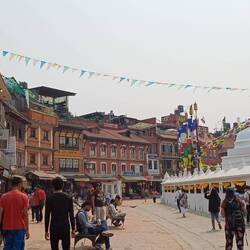 Am Bus angekommen geht es nach Klein Tibet... hier wartet die prächtige Bodnath Stupa auf uns...eine riesige weiße Kuppel mit Turm und Augen, die wohlwollend auf uns herab blicken....Stupa ist auch ein Grabhügel und so wird hier denen gedacht, die ins nächste Leben eingetreten sind ....es symbolisiert Buddha und seine Lehren...mit Gebetsmühlen ausgestattet umrunden viele die Stupa...drehen die Gebetsmühlen....beten...